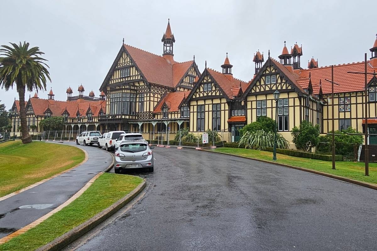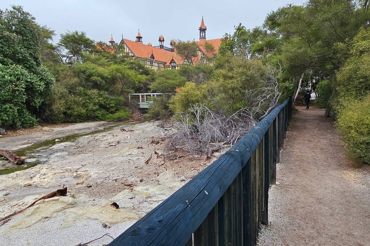 Walk back around the front of the Tutor Towers and Government Gardens. Enjoy views of the lake, geothermal steam, hot pools, and rich Maori history.