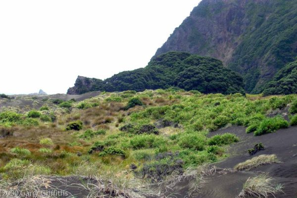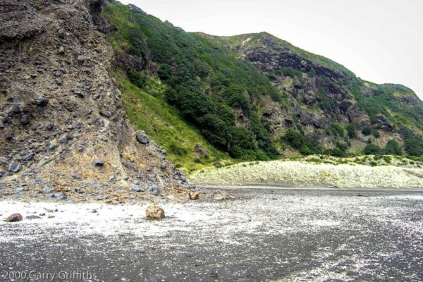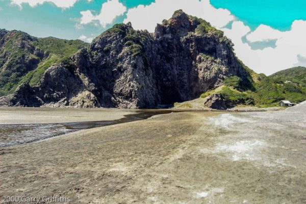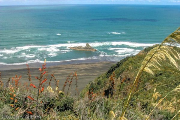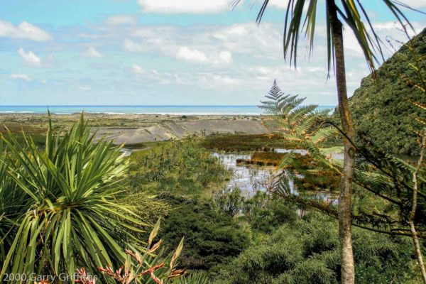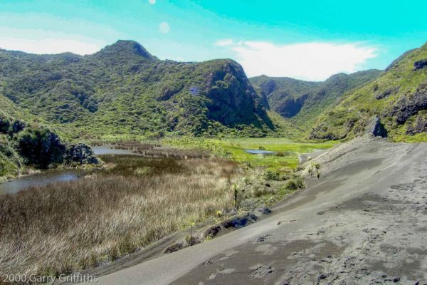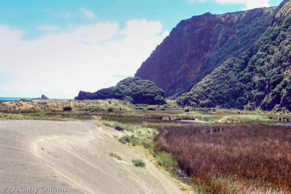 (30m min. 900m) Turnoff to Muir track is to the left and right will take you to the beach. Follow the track to the big black sand hill to the west. You might get your feet wet if there has been any rain in the last day or too. The track is sandy so take off your boots. There is a sign post just before you climb the sand hill, when you are standing on the top, walk to the right with the ocean over on your left shoulder. Once on the sand hill look back, to the Pararaha valley and the hill you walk down, (to the left of the photo).