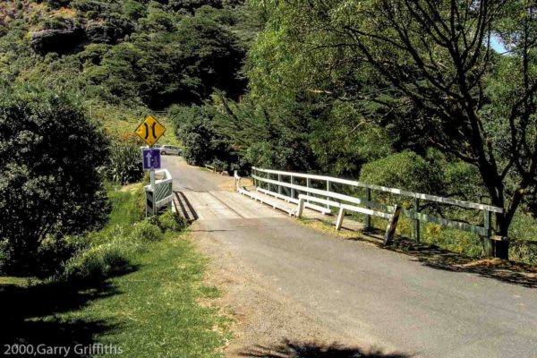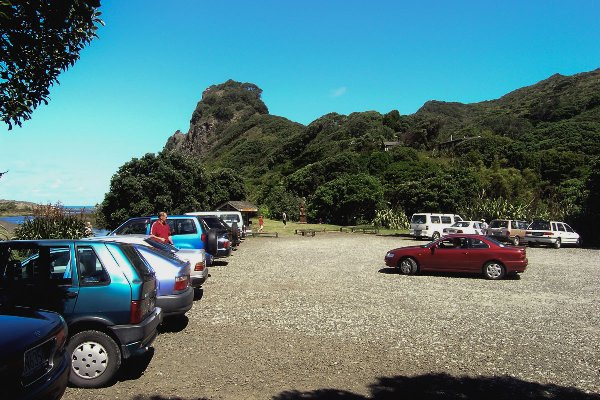 At Karekare Beach, pull into the car park on the right, lots of parking and toilets across the road. Walk back onto the road, turn right, walk over the bridge and turn hard right into the grassy picnic spot.