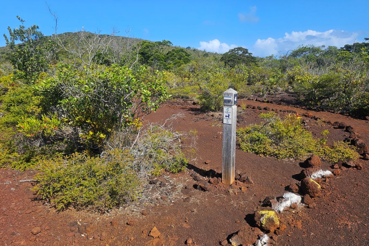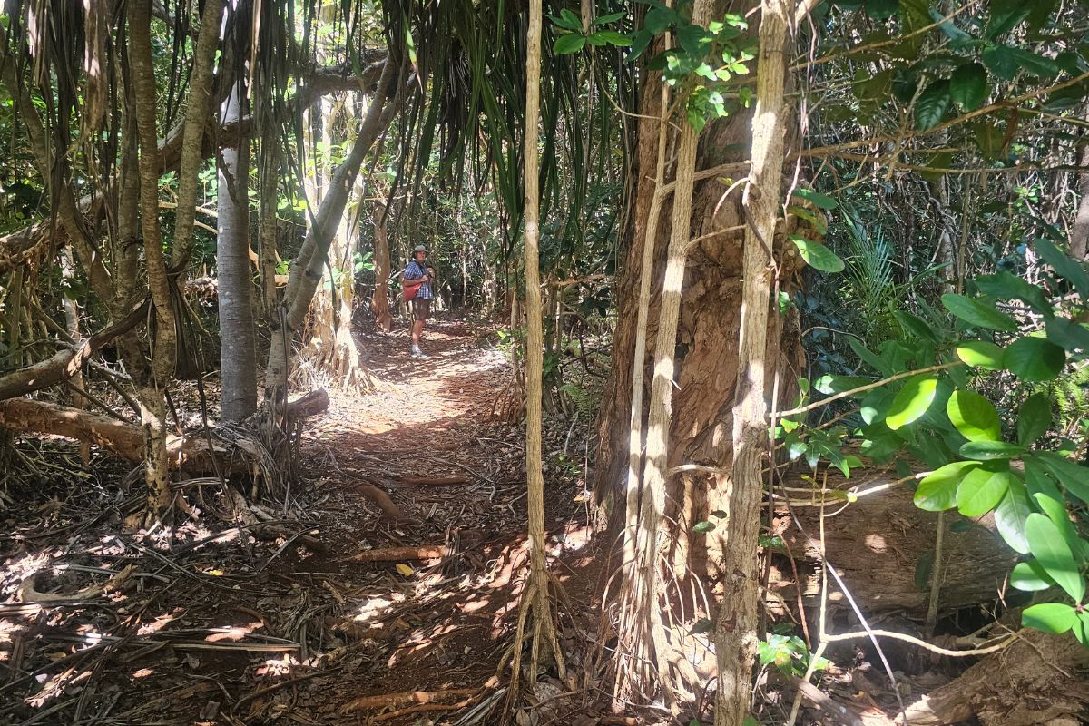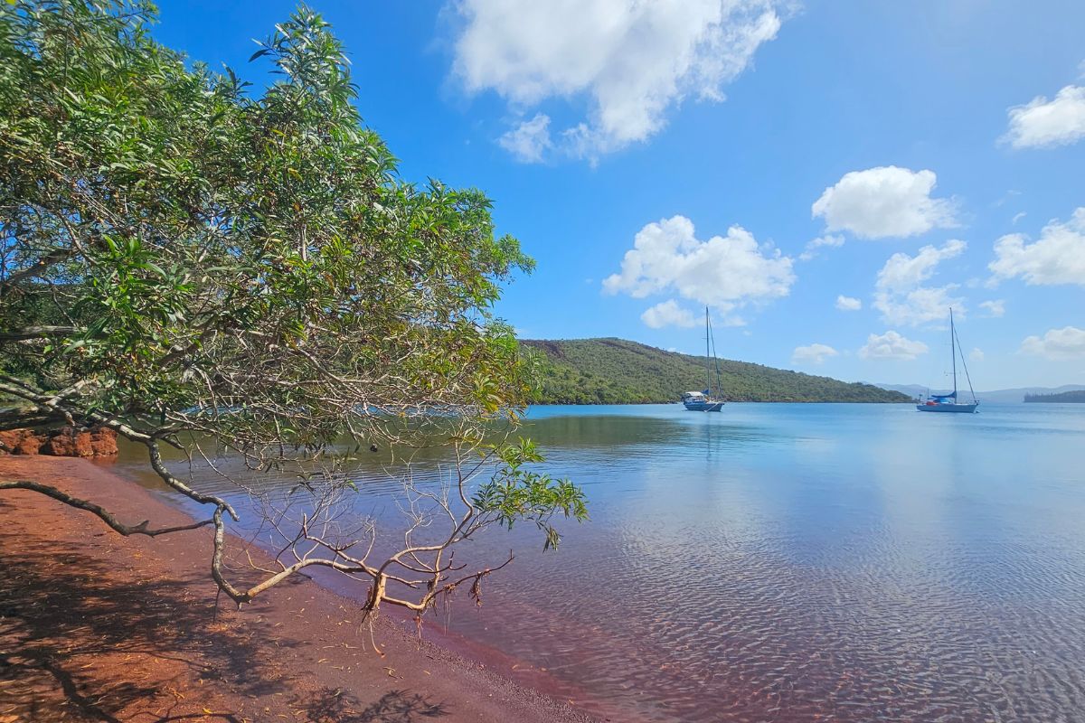 We started this walk by arriving by boat and tying the dinghy up at the little red sand beach. The sand is so fine it gets in everything!