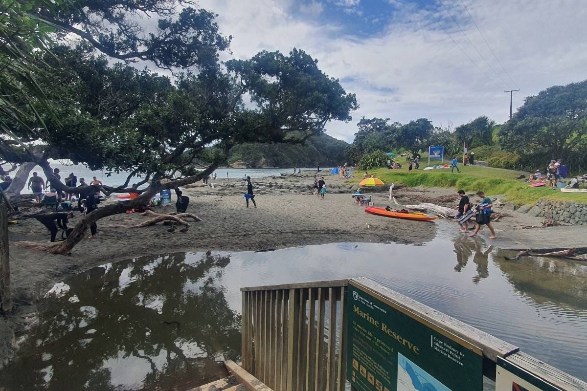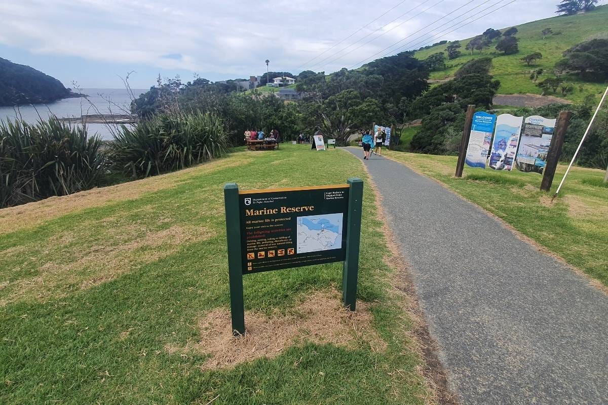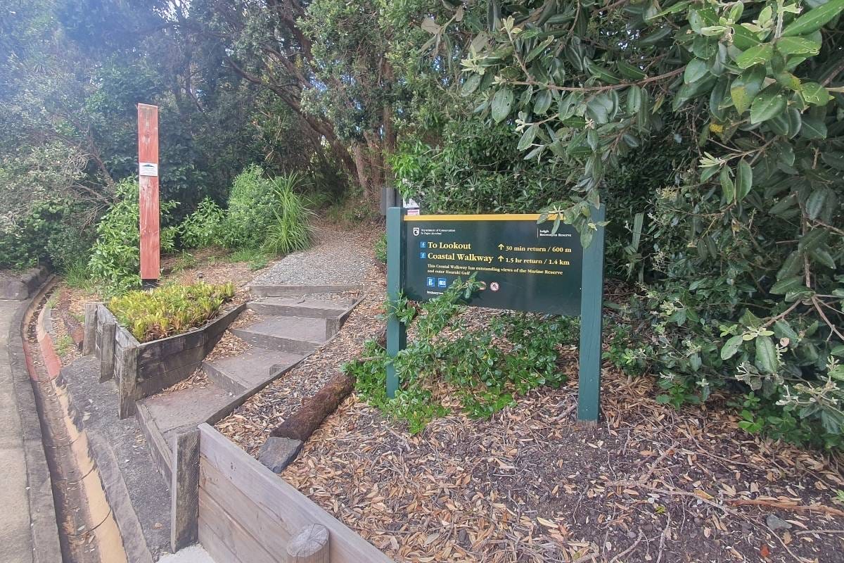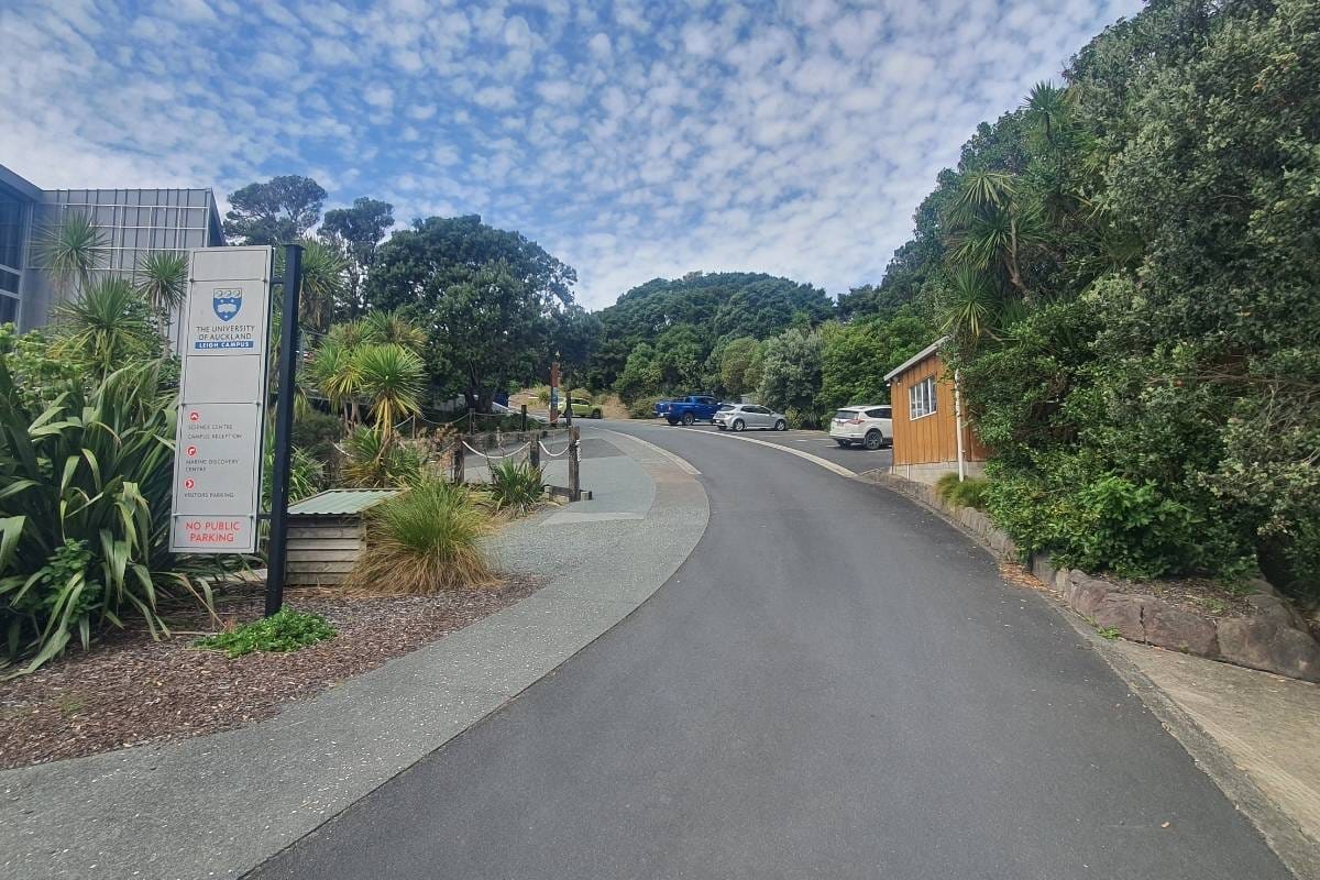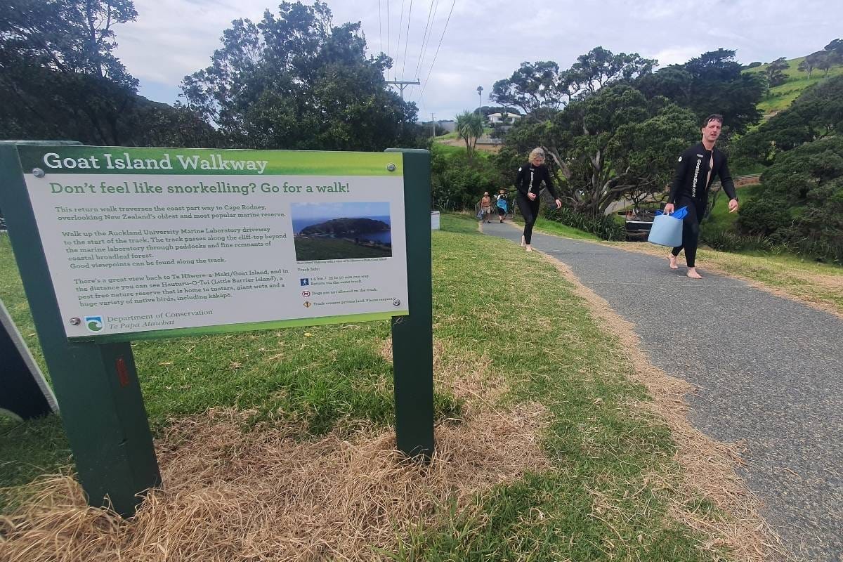 I start my walk at the main Goat Island car park, descending the hill and following the path toward the Auckland University Marine Laboratory, beginning at the signpost on the right side of the driveway.