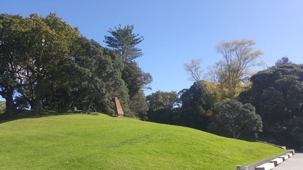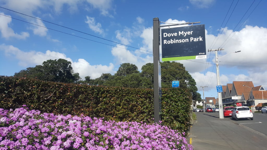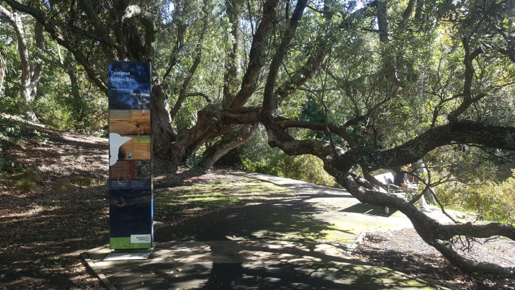 Head up the hill once again back towards Dove Meyer Robinson Park, enjoying the bush and sprawling Pohutukawa Trees. Notice the Wedge monument on the grass hill on your left, reminding us to not allow wedges to be driven between us.