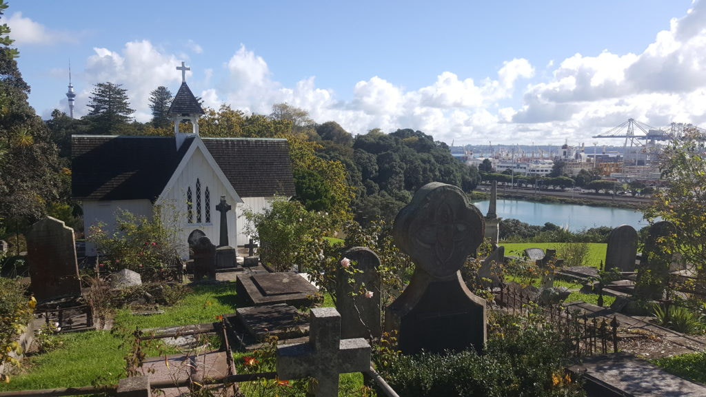 Journey on via Judges Bay to St, Stephens Anglican Church, a beautiful and historic old building, commenced in 1859. The graveyard contains interesting history of early Auckland. Pass through the churchyard archway and towards the expensive St Stephens Avenue, famous as the street of Sir John Key, former Prime Minister of NZ.