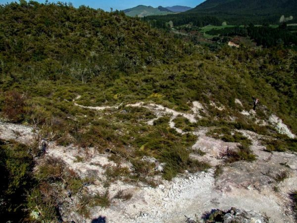 Now look to the south, follow the power line on your left running down to the road at the bottom of Rainbow Mountain. This is Kerosene Creek a thermal swimming hole. In the first photo you can just see the red car in the Kerosene Creek car park.