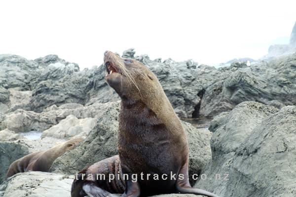 As you approach Rahautara at 22 km you will see a few seals on the rocks. The main car park is at half moon Bay. Once out of the car, you can stand on the edge of the road and look down at the seals. If it is a little too crowded, drive another 3 ks north to Paparoa Point, were there is a car par and an overnight camp over. You can walk out to the seals. But the rock you step on could be a seal, so be very careful. Take a gas mask, the smell will knock you over.