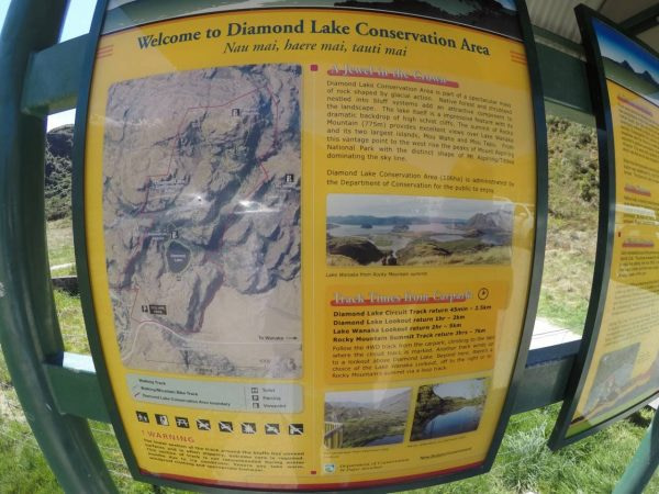 The turn off to Diamond Lake car park is tricky. As you descend into a valley, keep an eye out for the turn off on your right. Before you head off up the track, take a photo of the map on your cell phone, you will need to look at the photo as you walk around the track.