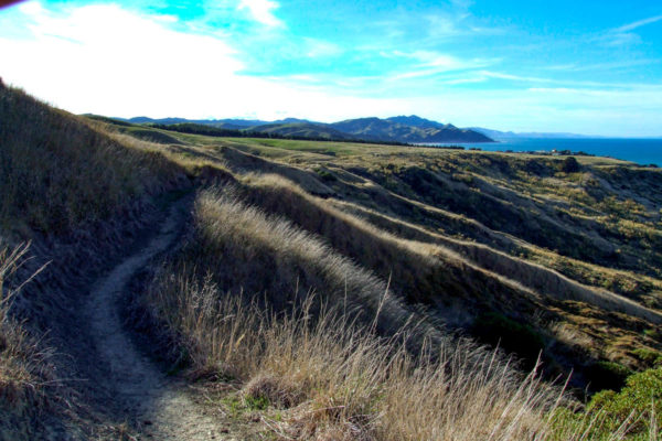 Down in the bay, the weather might be warm and sunny, but at the top, it can be another story. The wind can be quite strong and a little cold. Don’t walk to close to the edge of the cliff face, it is a long way to the bottom. There are no safety rails or fences to hold on to. Keep the kids tied to you. At the top, (40 min) looking south on a fine day, you can see Riversdale Beach at 23k = 211° = 41°5’32.3″S, 176°4’15.9″E Looking north is Cape Turn again 57 Ks = 036°= 40°29’24.6″S, 176°37’10.3″E